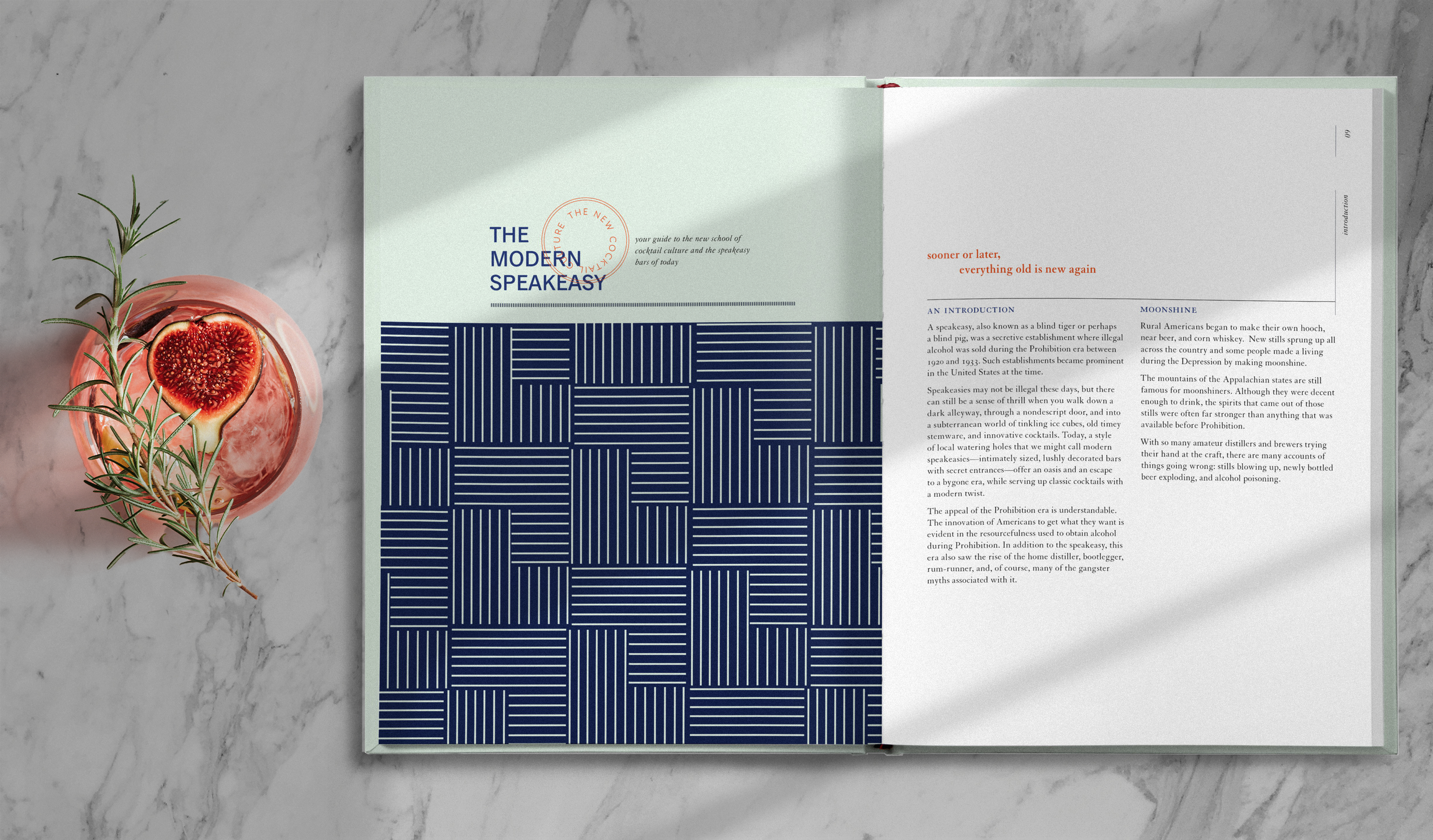 The project—Look development and layout for cocktail recipe book, Hunting Blind Tigers, A Guide to Modern Speakeasy Cocktails. Lush and layered visuals hint at the allure of the modern speakeasy, luxurious craft cocktail bars hidden in back rooms and behind unmarked doors.